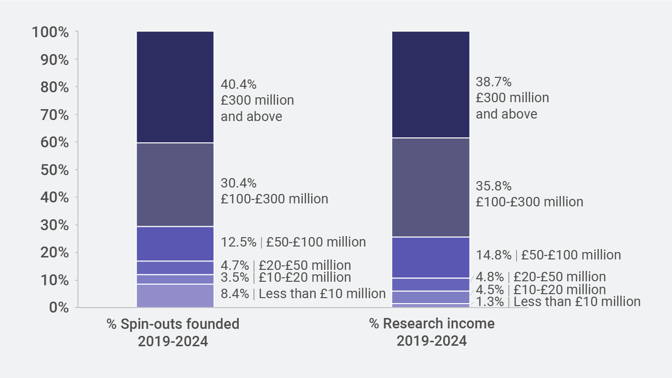 Figure 3b: The distribution of spin-outs and research income during the period 2019-2024 (HEBCI years) across groups of HEPs with different scales of research base