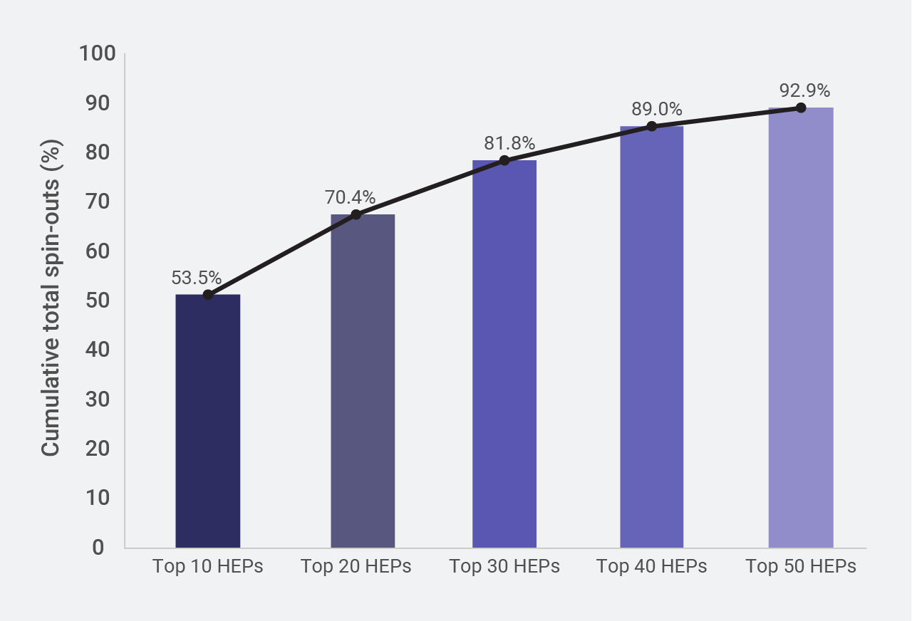 HEPs have been ranked by total numbers of spin-outs founded between 2013 and 2024.