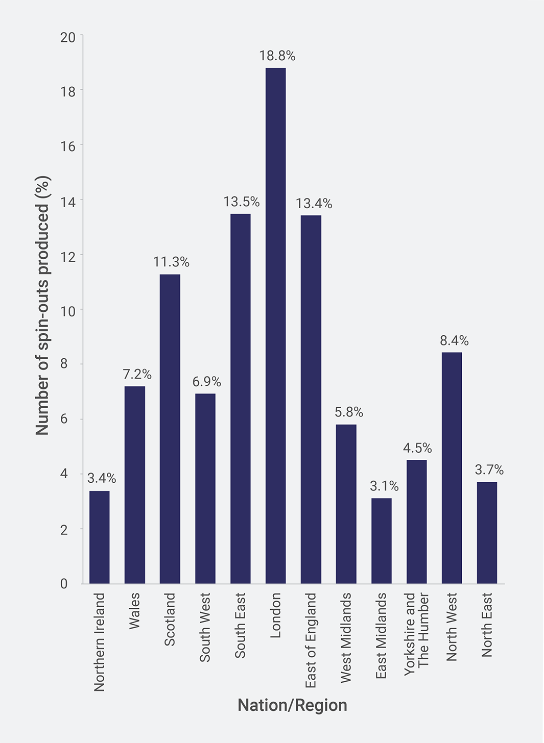 Understanding the regional distribution of spin-out production provides valuable insight into how innovation is spread across the UK.