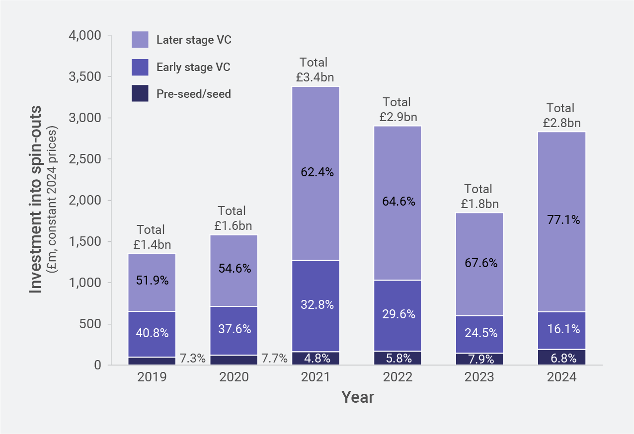 Figure 7: Pre-seed, seed, early stage VC and late stage VC investment into university spin-outs, listed in the spin-out register, between 2019 and 2024