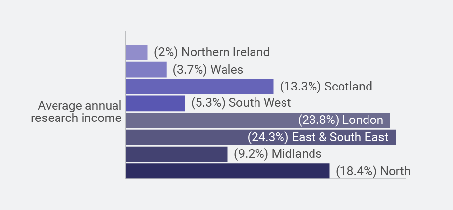This concentration mirrors the presence of four of the UK’s largest research-intensive universities, in addition to these regions being home to over half of all English institutions in total.