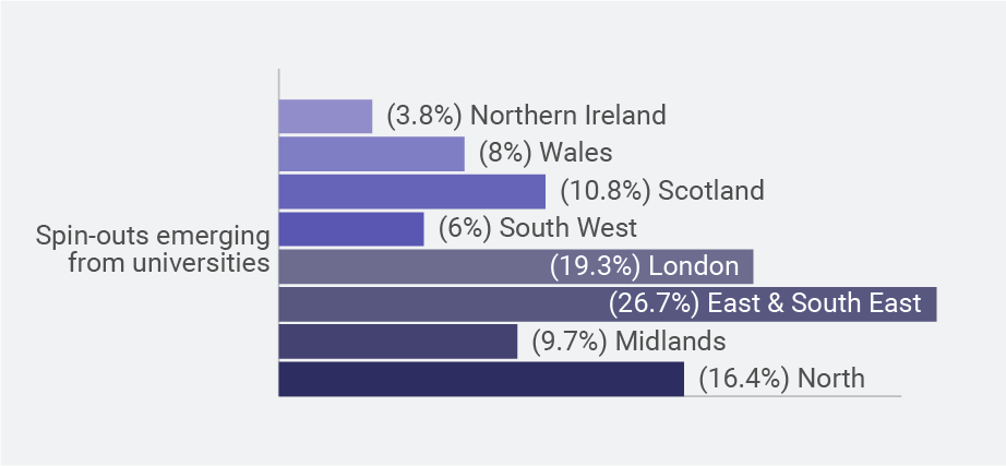 The pattern again demonstrates the strong link between research intensity and spin-out generation, whilst also highlighting potential opportunity for further growth across other regions.
